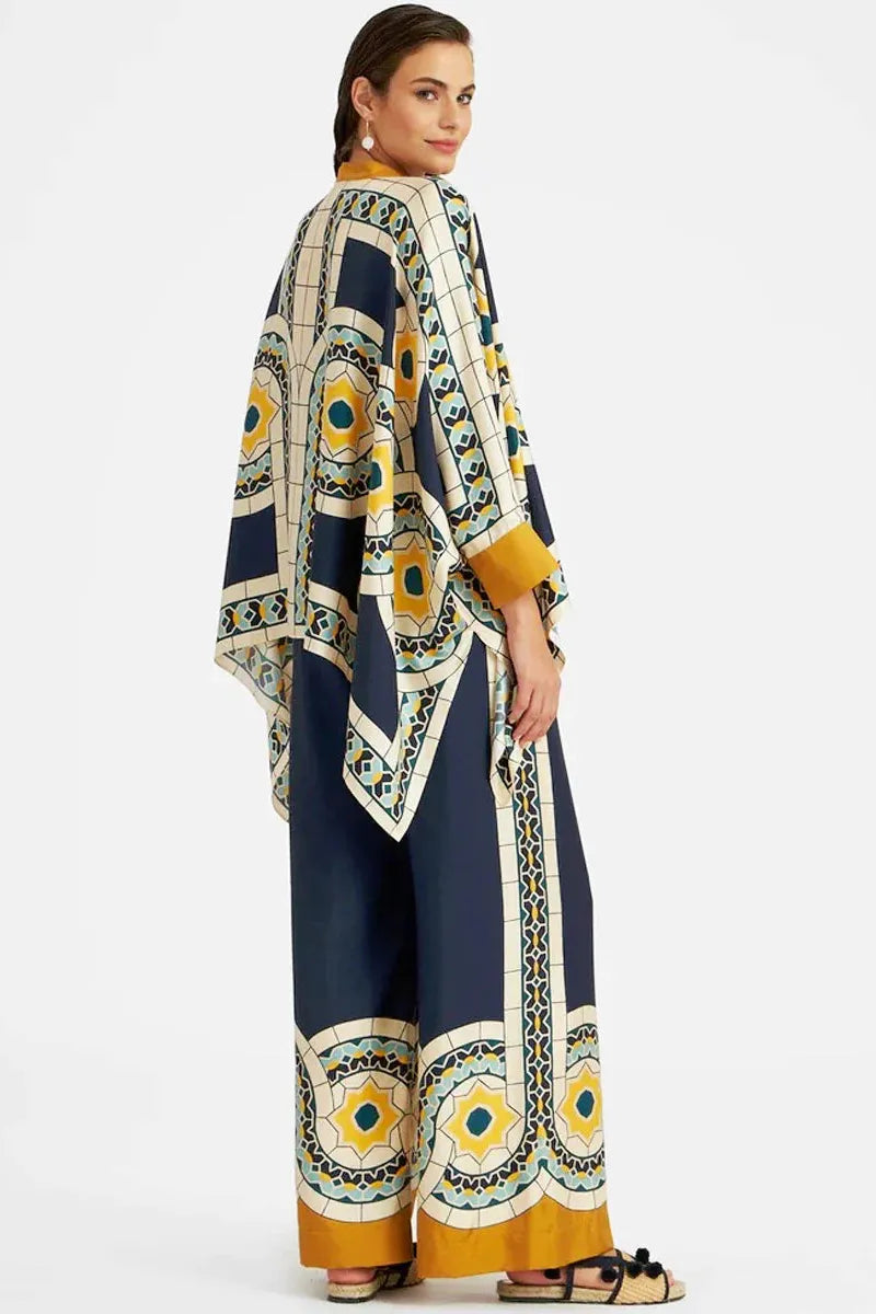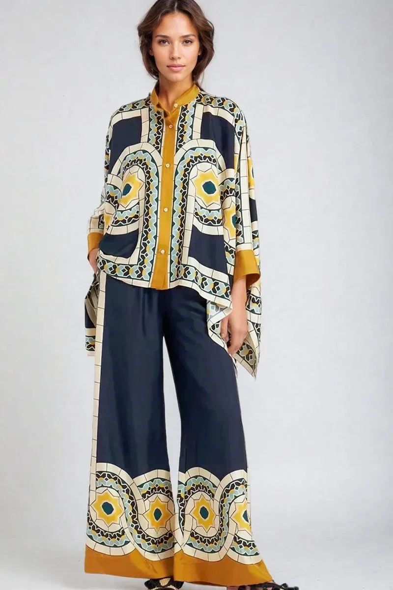 This satin set combines a flowy batwing-sleeve blouse with elegant wide-leg pants. Featuring vibrant yellow and blue floral tones, it’s designed for confidence, sophistication, and effortless glamour.